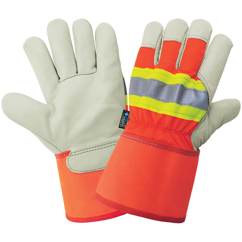 These gunn cut standard-grade grain cowhide gloves are lined with 140 grams of Cold Keep® insulation and feature 3M™ Scotchlite™ reflective tape on high-visibility orange nylon backing with a safety cuff.