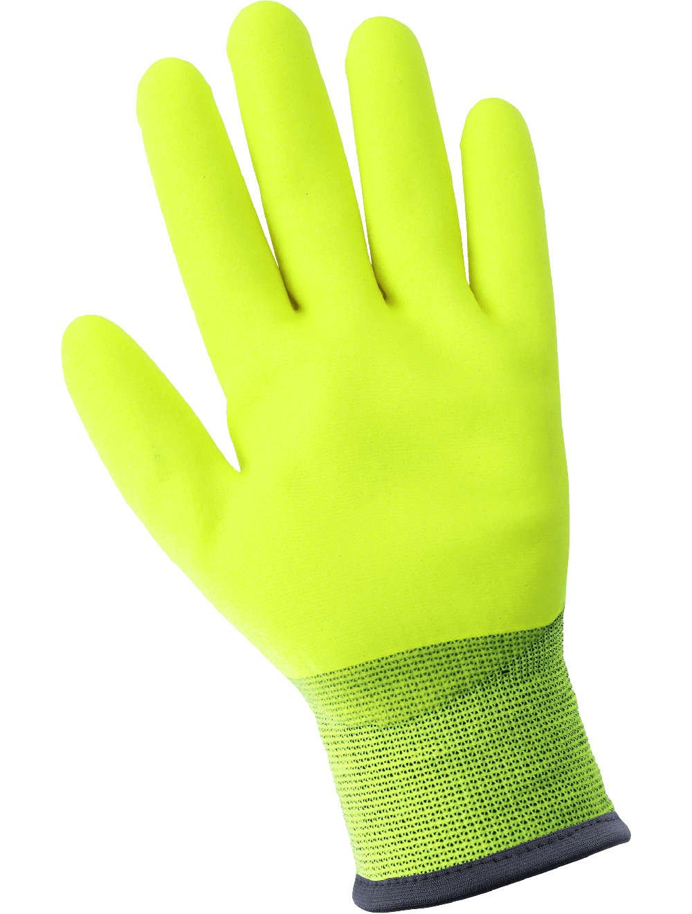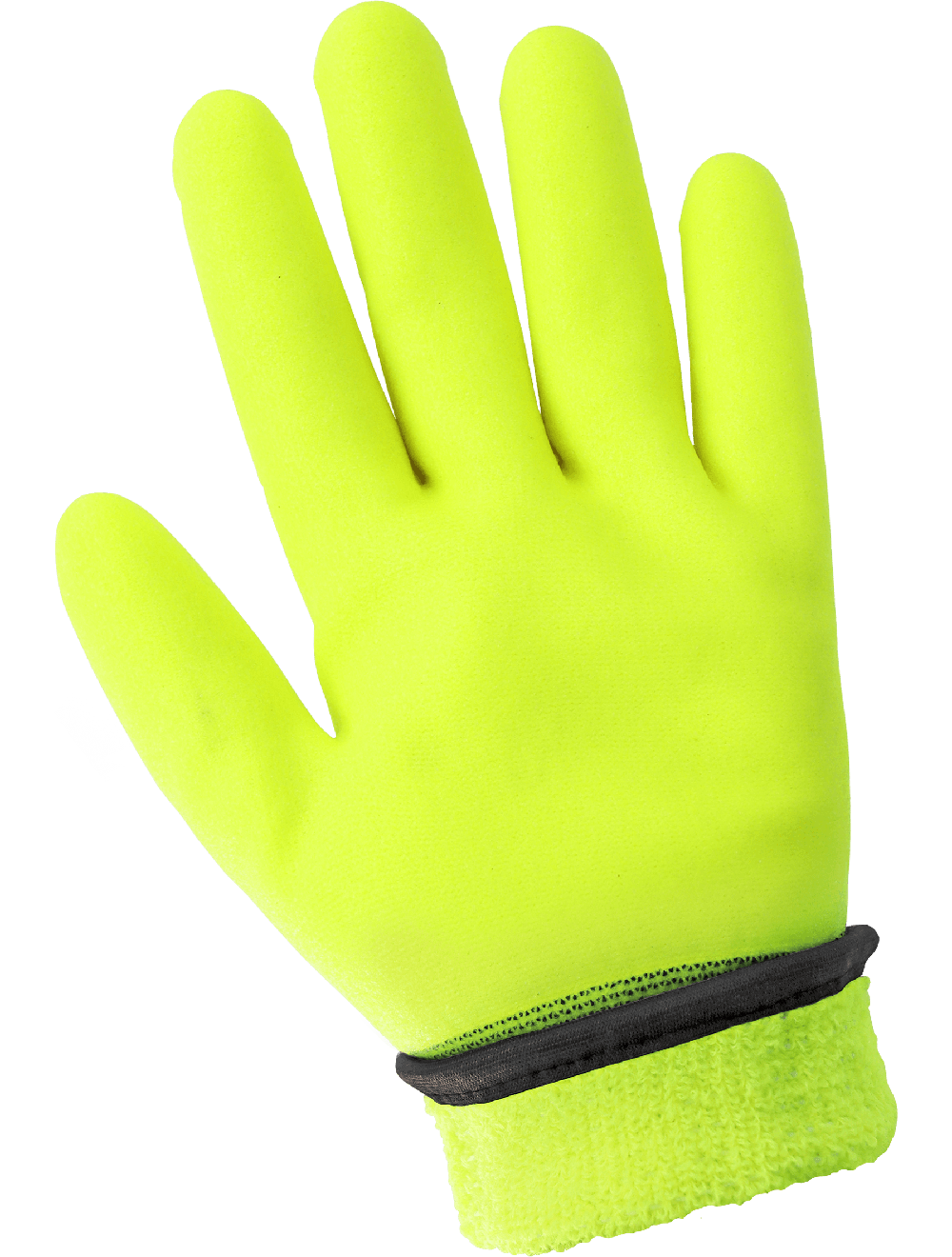 These low-temperature gloves have a 13-gauge high-visibility yellow/green seamless nylon shell over a 7-gauge soft brushed acrylic terry cloth inner liner. The high-visibility yellow/green foam PVC three-quarter-coated palm protects from liquids while providing grip. A knit wrist gives the user a secure fit.