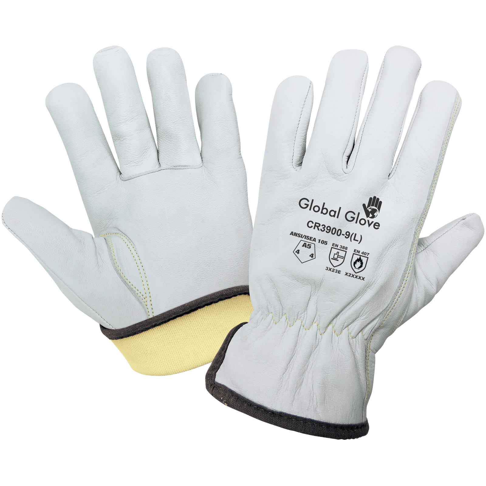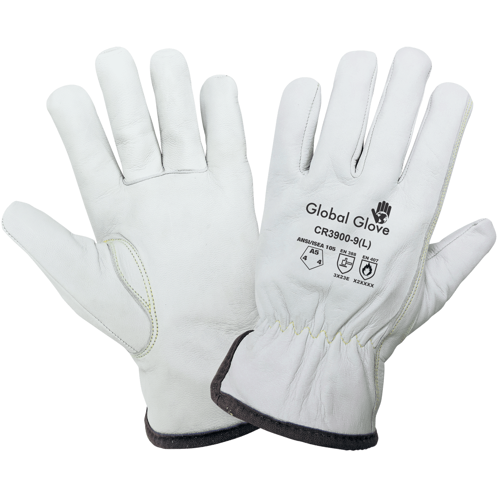 These standard-grade white grain goatskin leather driver gloves are an outstanding cut-resistant option. This glove has a Gunn cut pattern and features a thin Aralene® (enhanced aramid fiber) sewn-in liner for added durability. The keystone thumb reduces hand fatigue and the open cuff allows for easy donning and removal. Sewn with aramid fiber for added cut and heat protection.