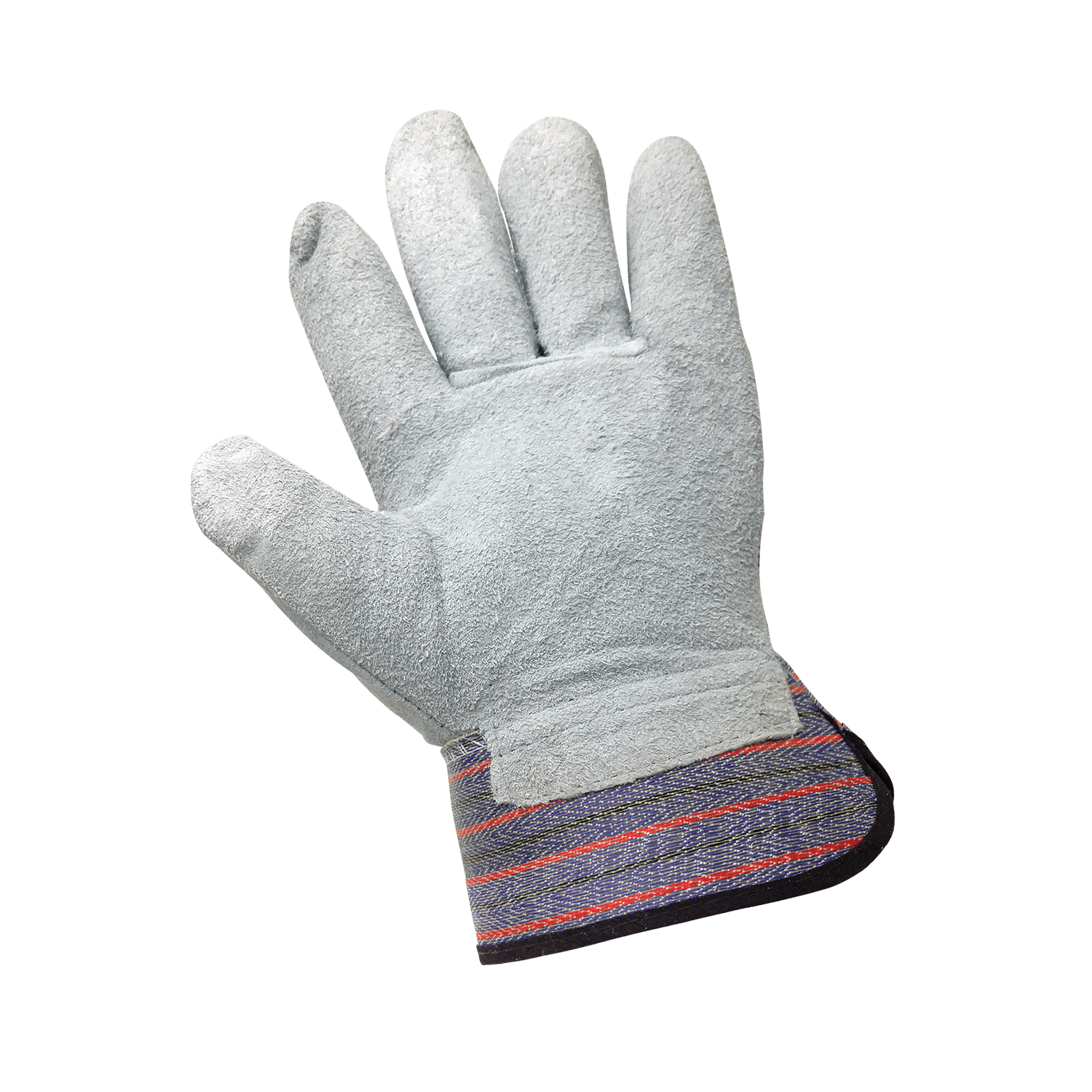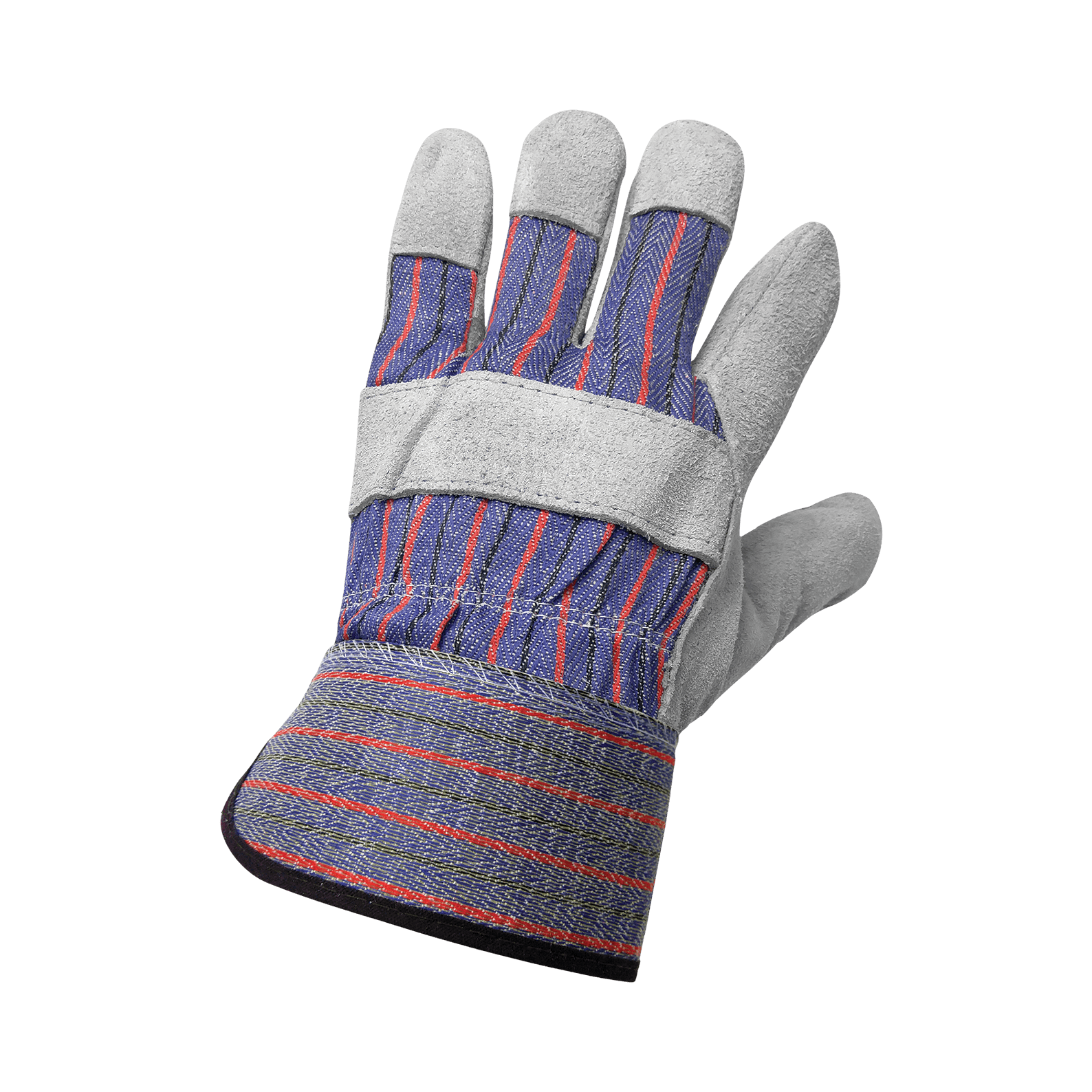 These economy leather palm gloves feature a gray shoulder split cowhide leather palm and a blue/red/black striped 7 oz. cotton canvas back. The gloves have a gunn cut pattern, a wing thumb, and a leather knuckle strap for an added layer of protection. Rubberized safety cuff extends protection up the arm and allows fast removal to protect fingers if the glove gets caught in machinery.