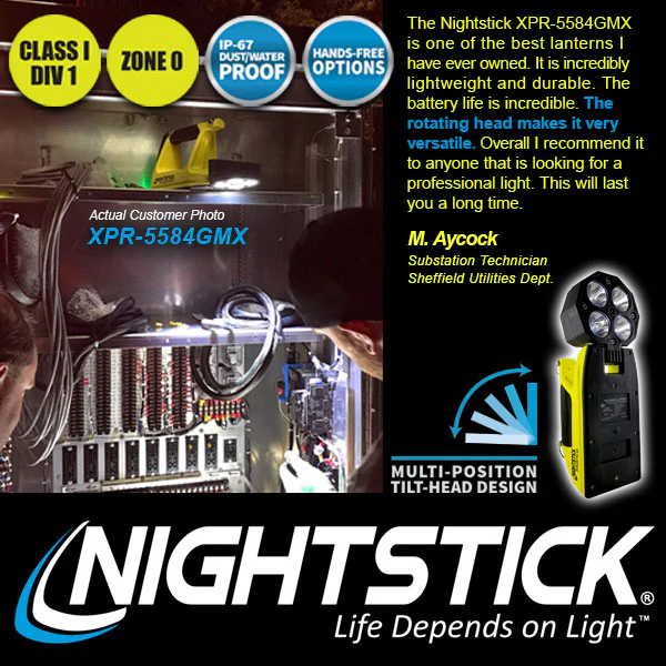 The 5584 is a cULus-certified Class I DIV 1, ATEX Zone 0, INMETRO, KOSHA, and IECEx certified with a charger that meets the requirements of NFPA-1901-14.1.10.2 (2024) mounted in any position. It’s powered by an integrated rechargeable lithium-ion battery and comes with a charger base, AC and DC chargers, and a carry strap.