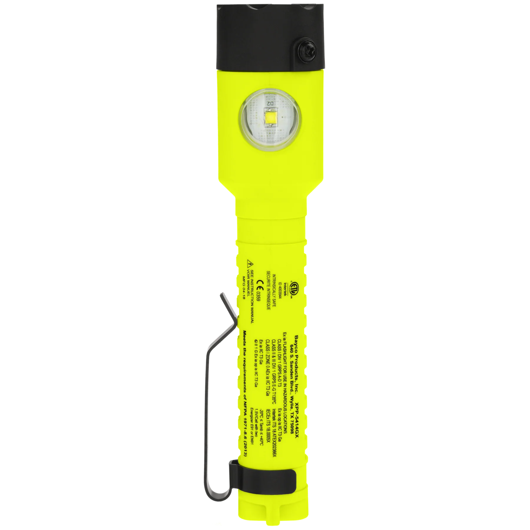 This Intrinsically Safe (cETLus, UKCA, ATEX Zone 0 and IECEx) Dual-Light LED flashlight offers peak performance in hazardous work environments. Use the top-mounted buttons to trigger the flashlights focused distance lighting and the floodlights expansive close-up illumination. Maximize the safety and functionality benefits by simultaneously activating both lights in Dual-Light Mode. Features easy-to-use top-mounted switches, durable glass-filled nylon polymer housing, an integrated magnet on base, and a reversible pocket clip. Certified cETLus, ATEX, and IECEx Intrinsically Safe LED. Includes Flashlight / Floodlight / Dual-Light Modes (flashlight and floodlight for maximum safety and utility). Meets requirements for NFPA-1971-8.6 (2018). Rated IP-67 dustproof/waterproof. Powered by 2 AA (not included).