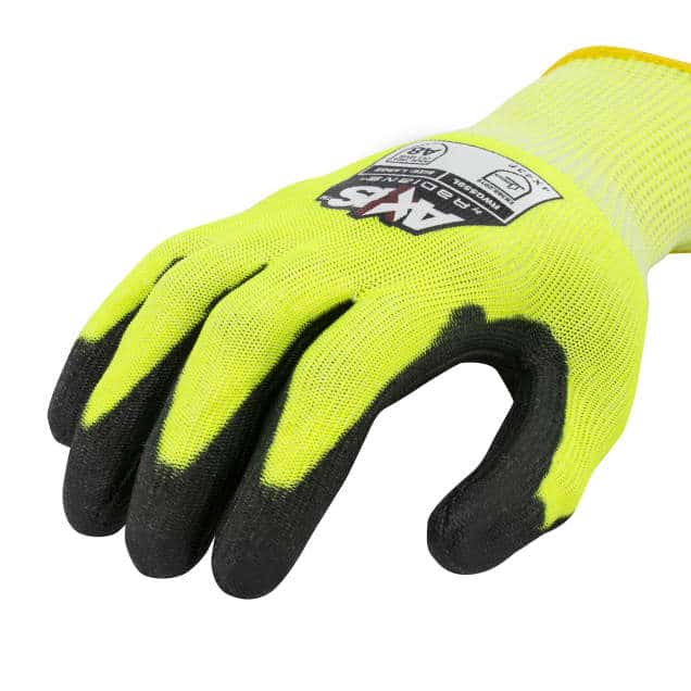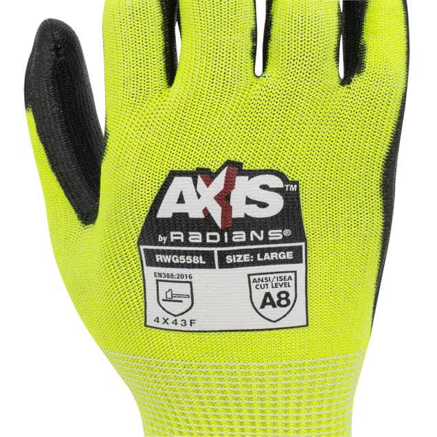 The RWG558, an Axis™ Series glove by Radians, has an ANSI Cut rating of A8 and an EN388 TDM-100 cut rating of F. The RWG558 glove features a 13 gauge, hi-vis green HPPE outer shell with fiberglass and stainless steel to provide significant protection against abrasion and cuts. The black PU palm coating provides excellent gripping power.